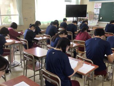 本日は,全校集会した後,3教科分実力テストを実施しました。