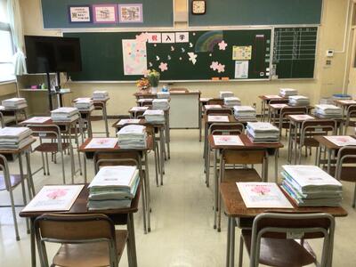 新入生の机の上には,教科書や配付物がまとめて置いてありました。