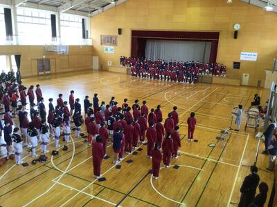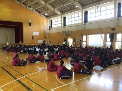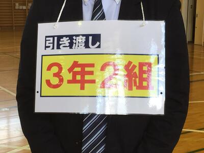 今回は雨天時を想定し,体育館で引き渡しをしました。
