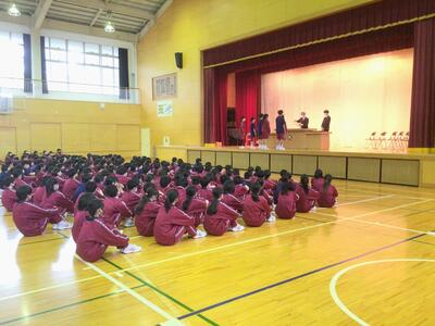 前半は生徒会執行部のメンバーから,生徒会活動の説明,生徒会スローガンの紹介,職員室の入室の仕方や電話の利用方法等の説明がありました。寸劇を入れながらの説明はとても分かりやすかったです